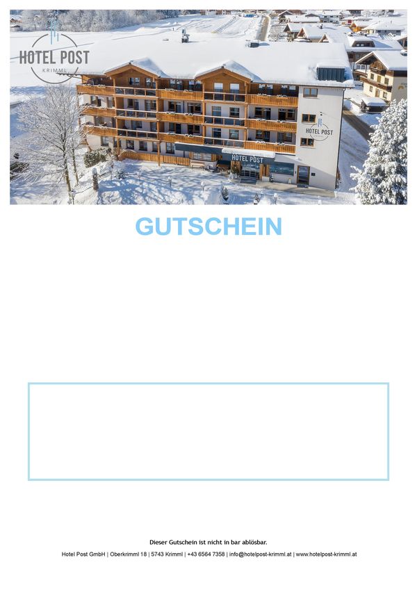 Ich möchte Dir mit diesem Gutschein eine kleine Freude bereiten.Genieße einzigartige Stunden im Hotel Post Krimml und lass' wieder mal richtig die Seele baumeln!